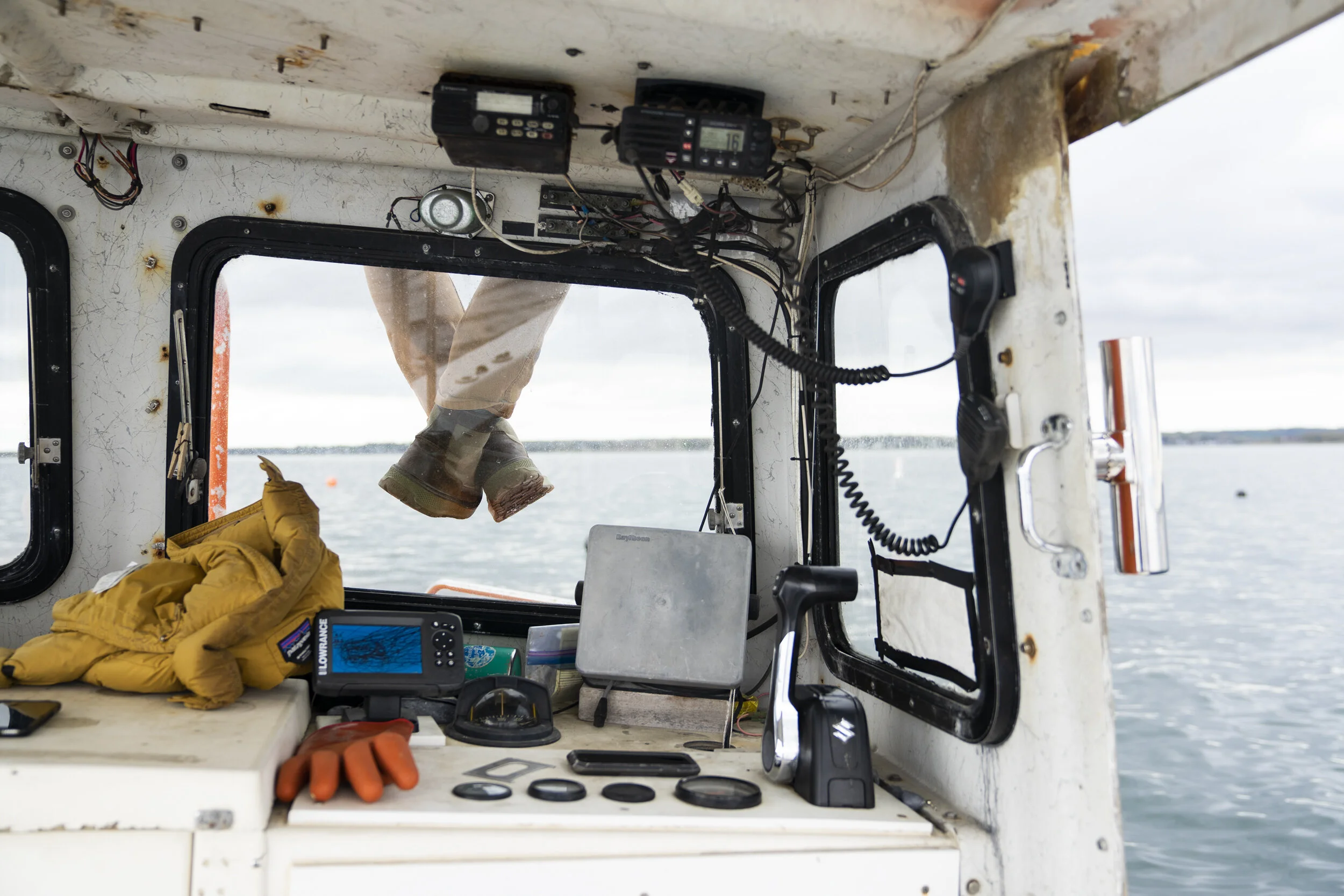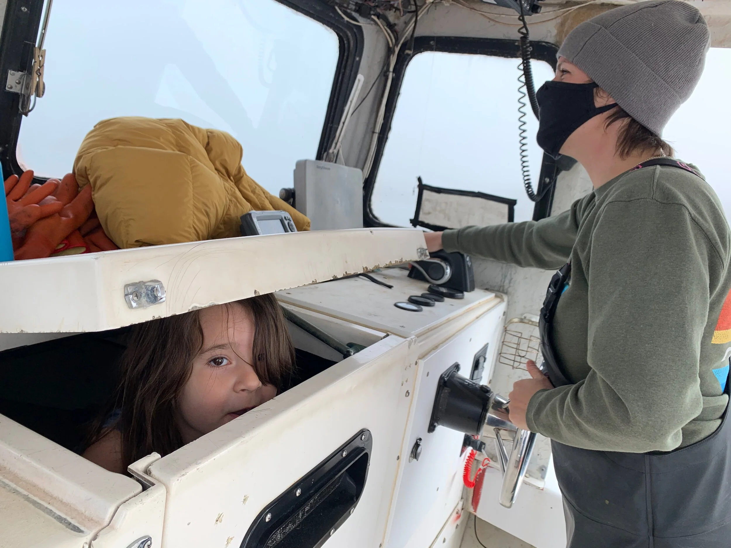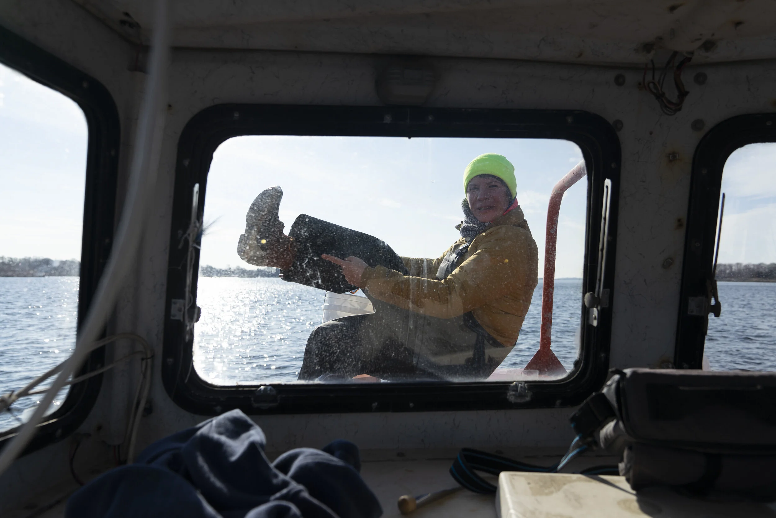 Suzie pointing at her duck boot that she used to clean duck shit off the window